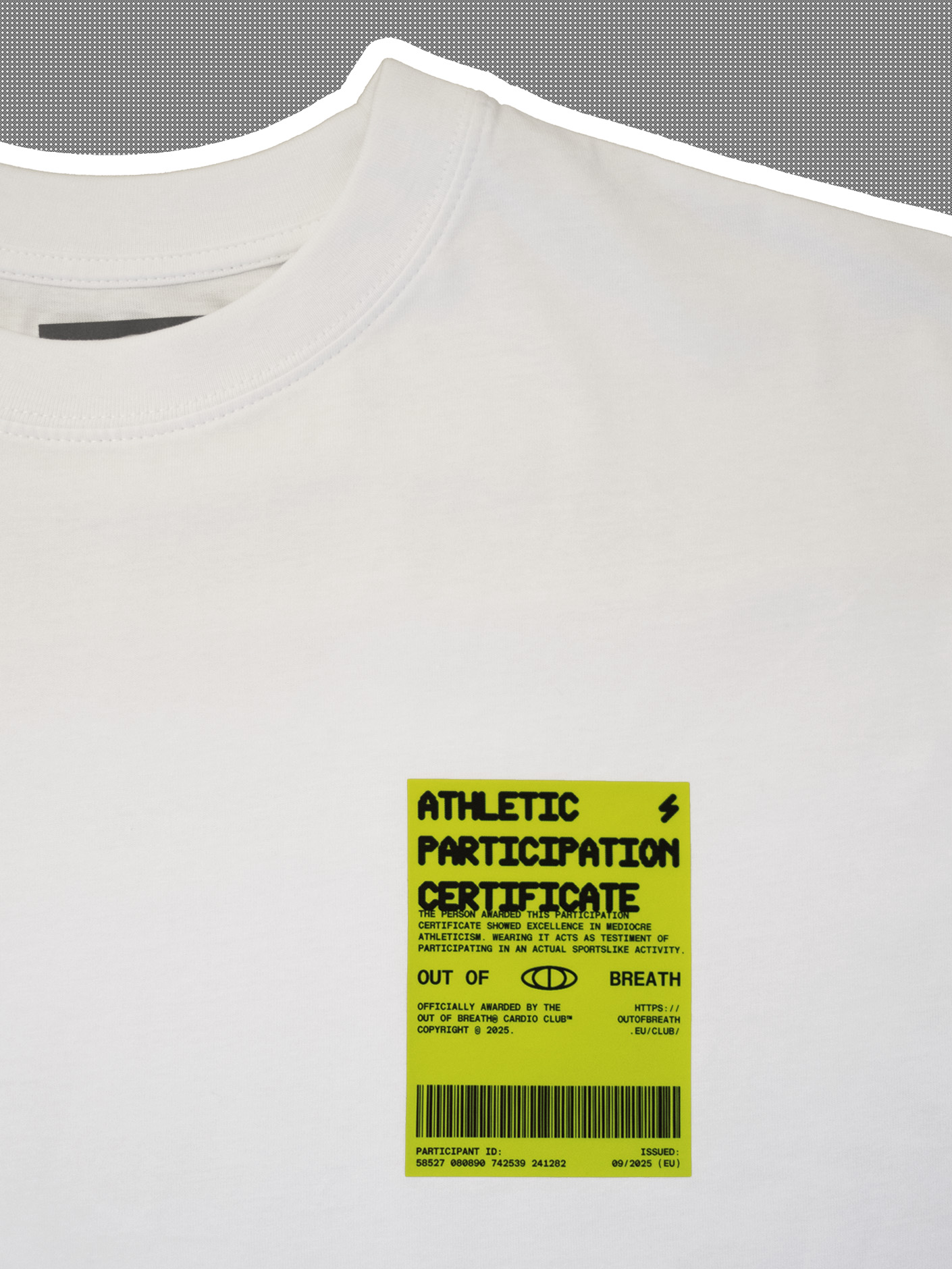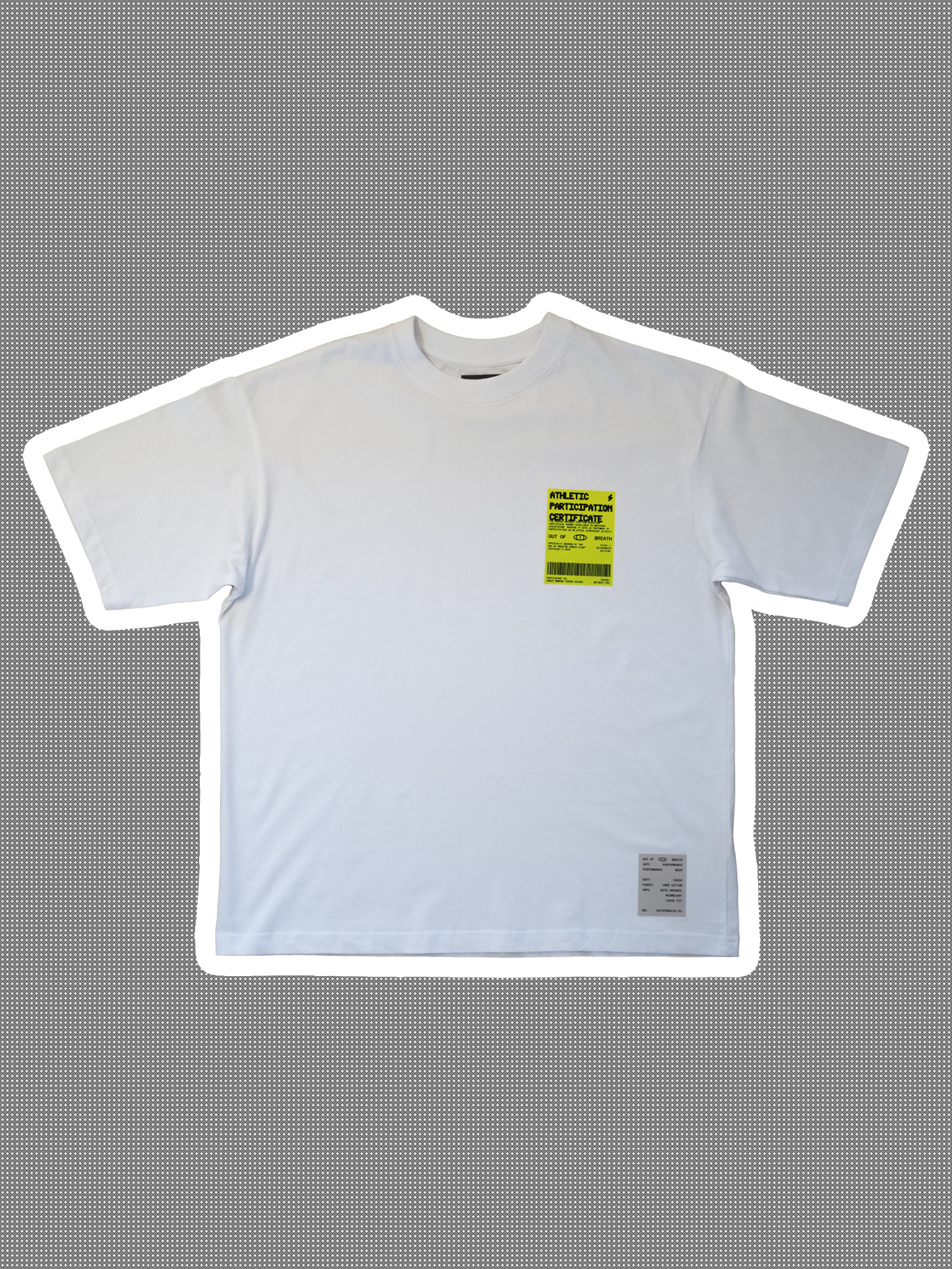 This is a white, oversized t-shirt with a neon participaction ceritifcicate on the left side of the chest.Anti performance performance wear
